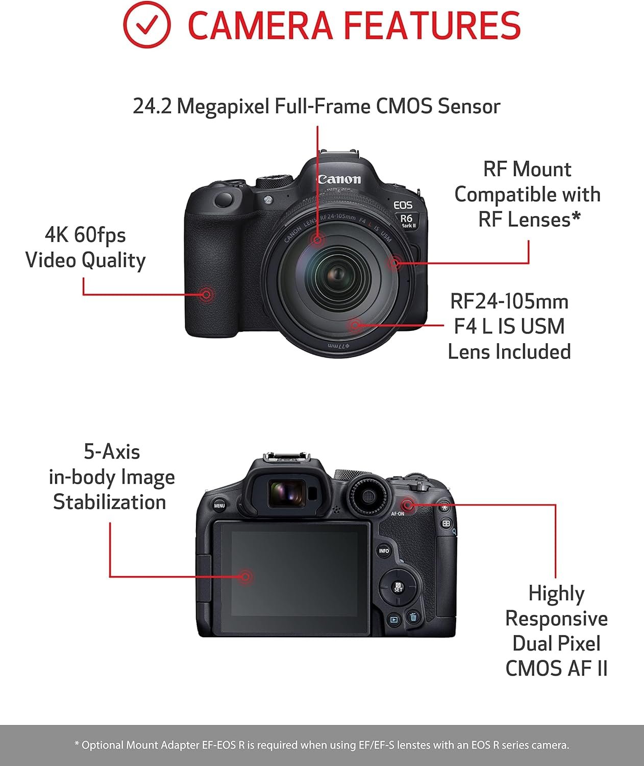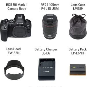 โปรโมชันพิเศษออนไลน์ ฿129.00 เท่านั้น :Canon EOS R6 Mark II Mirrorless Camera ชุดเลนส์ RF24-105mm F4 L USM กล้องฟูลเฟรมไฮบริด ความละเอียด 24.2MP เซนเซอร์ CMOS ถ่ายภาพนิ่งและวิดีโอ รองรับเมาท์ RF สีดำ